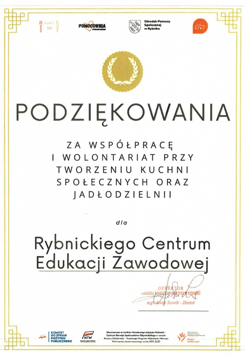 Podziękowania za współpracę i wolontariat przy tworzeniu kuchni społecznych oraz jadłodzielni. |